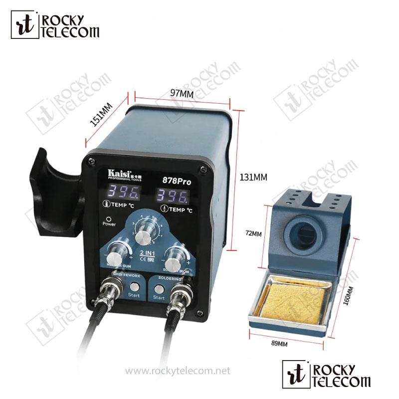 The Kaisi 878 Pro is a high-performance, 2-in-1 rework station that combines a hot air gun and soldering iron into one compact unit. Designed for precision electronics repair, it features a smart digital display for accurate temperature control, making it perfect for mobile, laptop, and circuit board repairs.