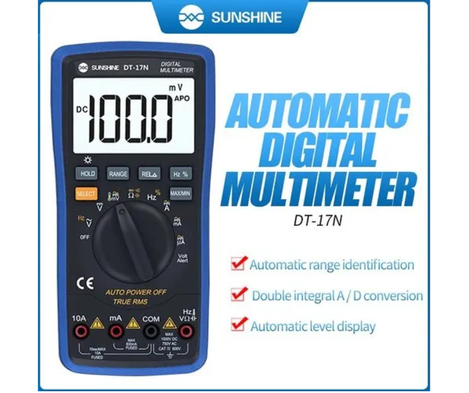 The Sunshine DT17N Digital Multimeter is a professional-grade, 4-digit precision measurement tool designed for electronics repair, automotive diagnostics, and household electrical testing. Built for reliability and accuracy, this multimeter is ideal for technicians, engineers, and DIY enthusiasts.